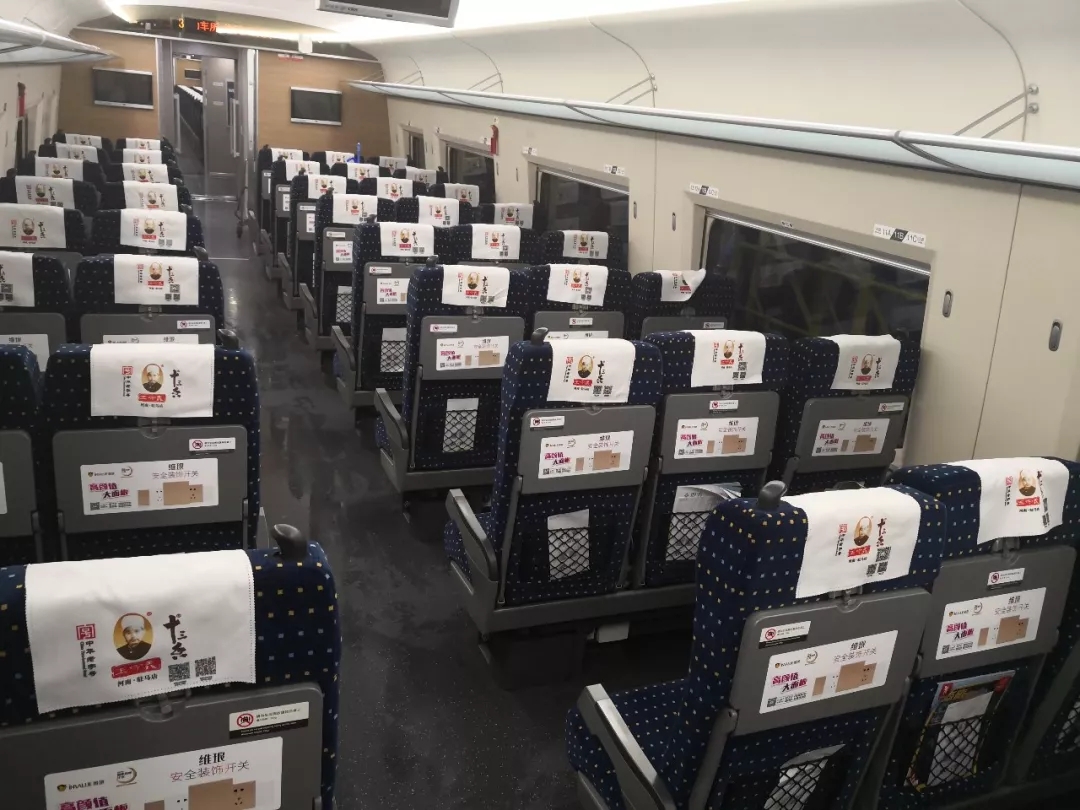 此次投放的主要广告形式是列车全媒体广告、包括:头巾、小桌板、海报等形式。