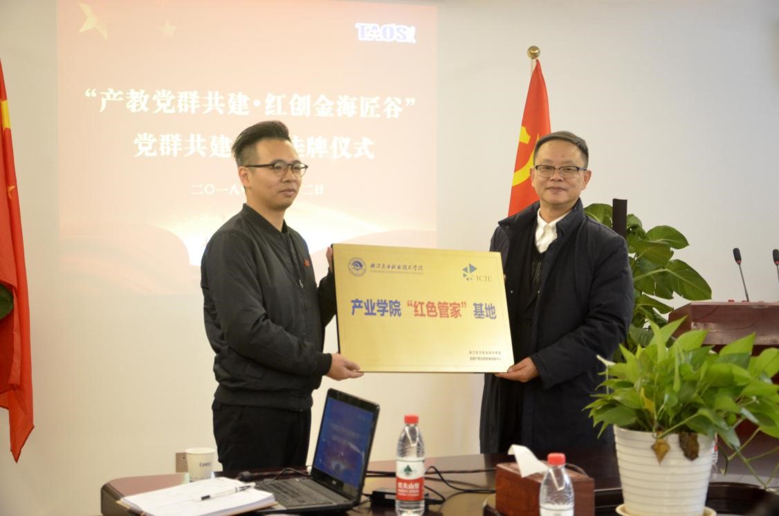 最后,在全体与会同志的见证下,浙江东方职业技术学院校长胡新根同志与公司党支部书记陈增同志为党群共建基地进行了揭牌。